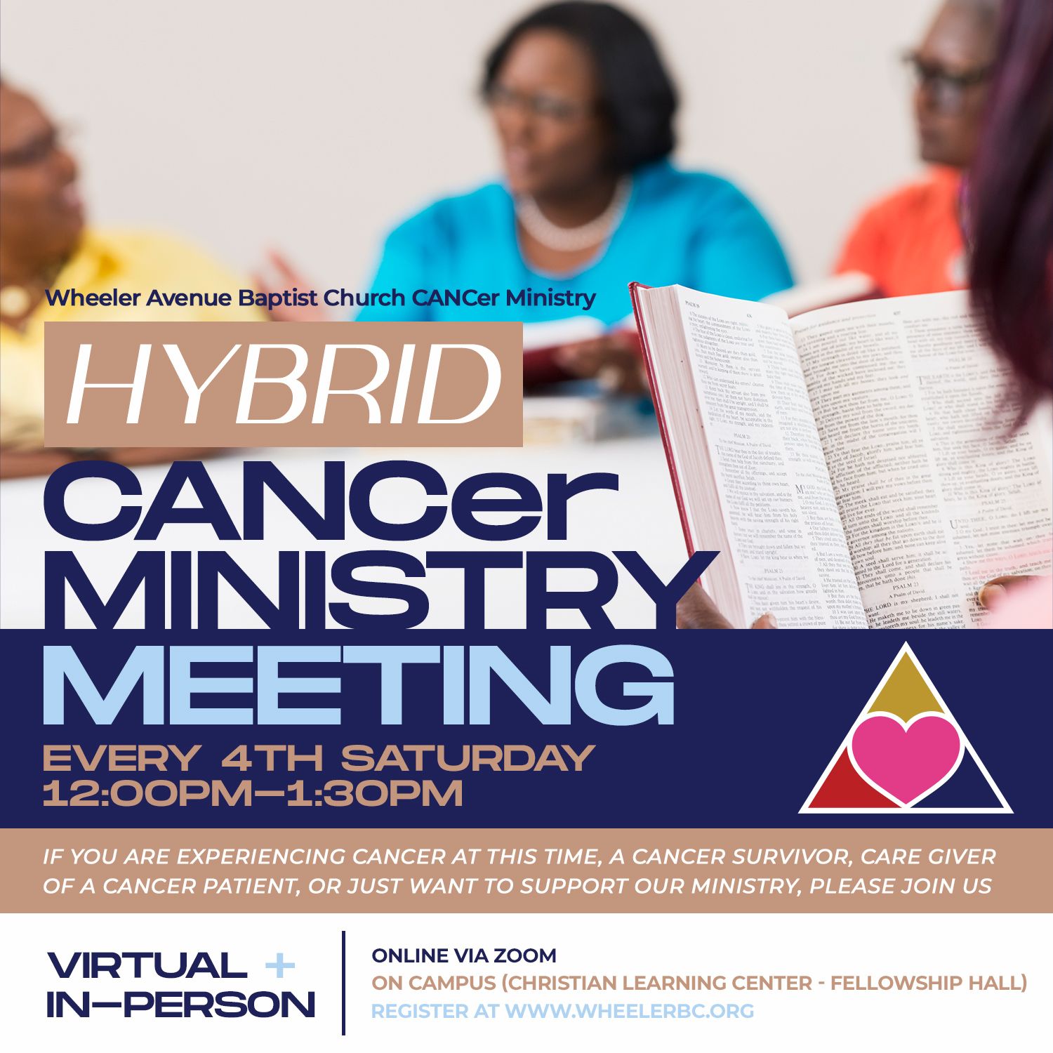 The WABC Cancer Ministry serves our church members who are experiencing cancer & their families, caregivers, and cancer survivors. If you are interested to be a part of our support team, please contact us at [email protected] (https://wheelerbc.org/cdn-cgi/l/email-protection). Our Ministry meetings are virtually and in-person from 12:00pm to 1:30pm every forth Saturday of every month. We provide speakers, updated information from professional, and spiritually food for their journey through the word of God.