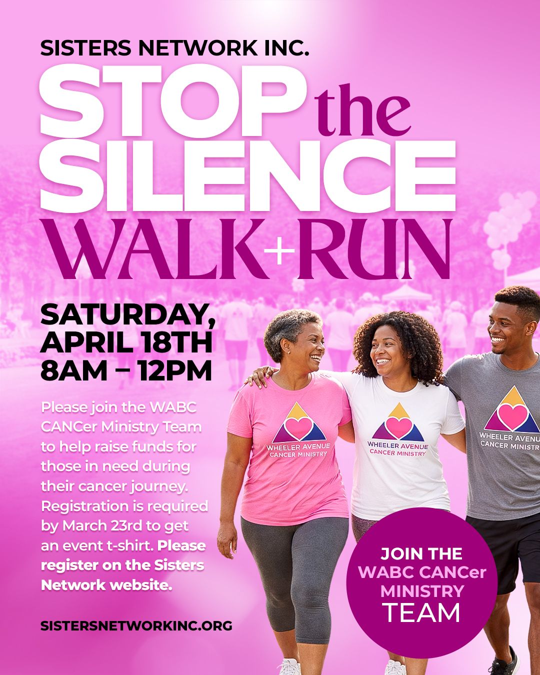 The Stop the Silence Walk/Run sponsored by Sisters Network, Inc. will take place Saturday, April 18th. Please be a part of the WABC CANCer Ministry Team to help raise funds for those in need during their cancer journey. Registration is required on the Sisters Network website. The